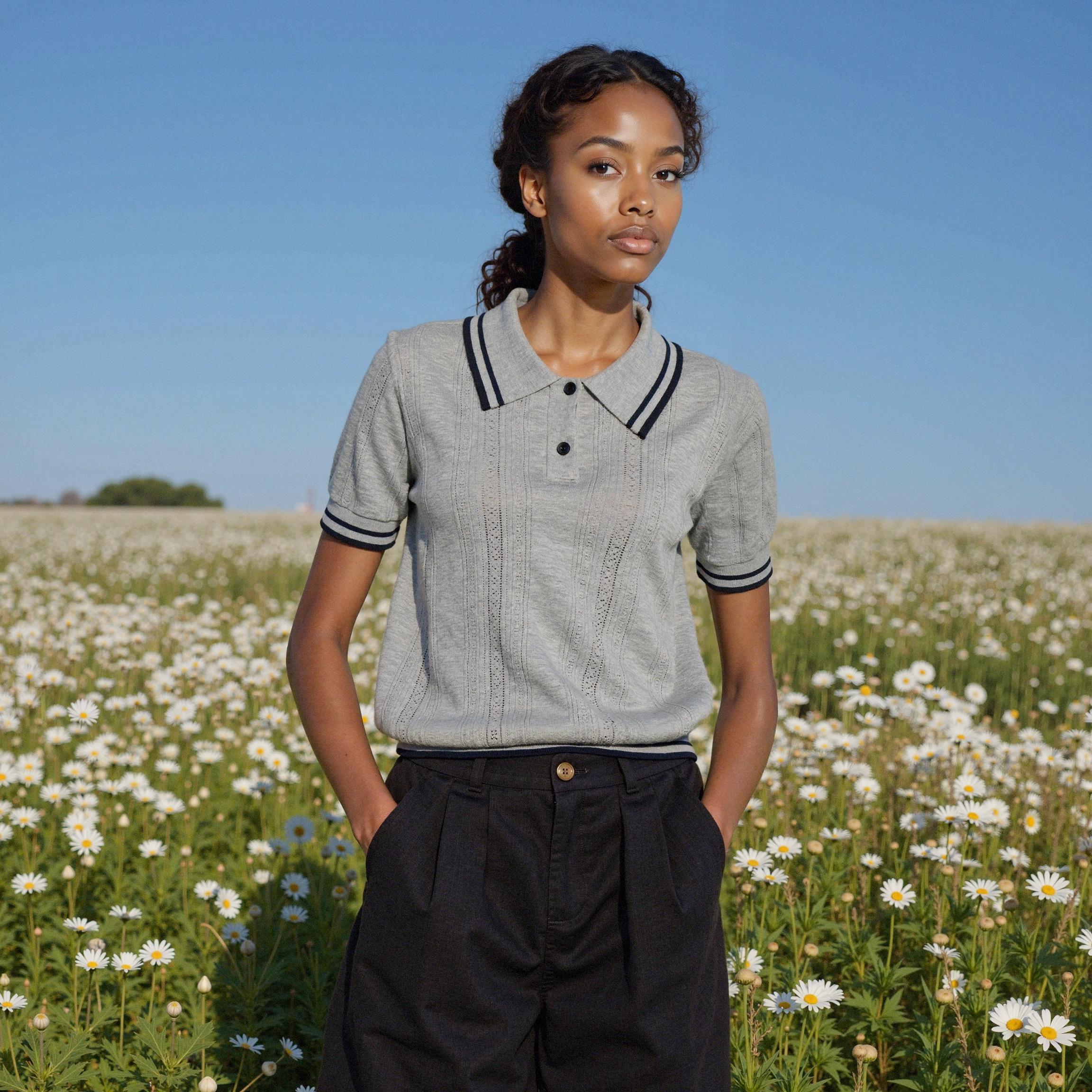 Using our LaonGEN service is remarkably simple. We simply uploaded one original image of 96Newyork's Collar Short-Sleeve Knit, and the AI autonomously generated new images, changing backgrounds, poses, and even lighting.