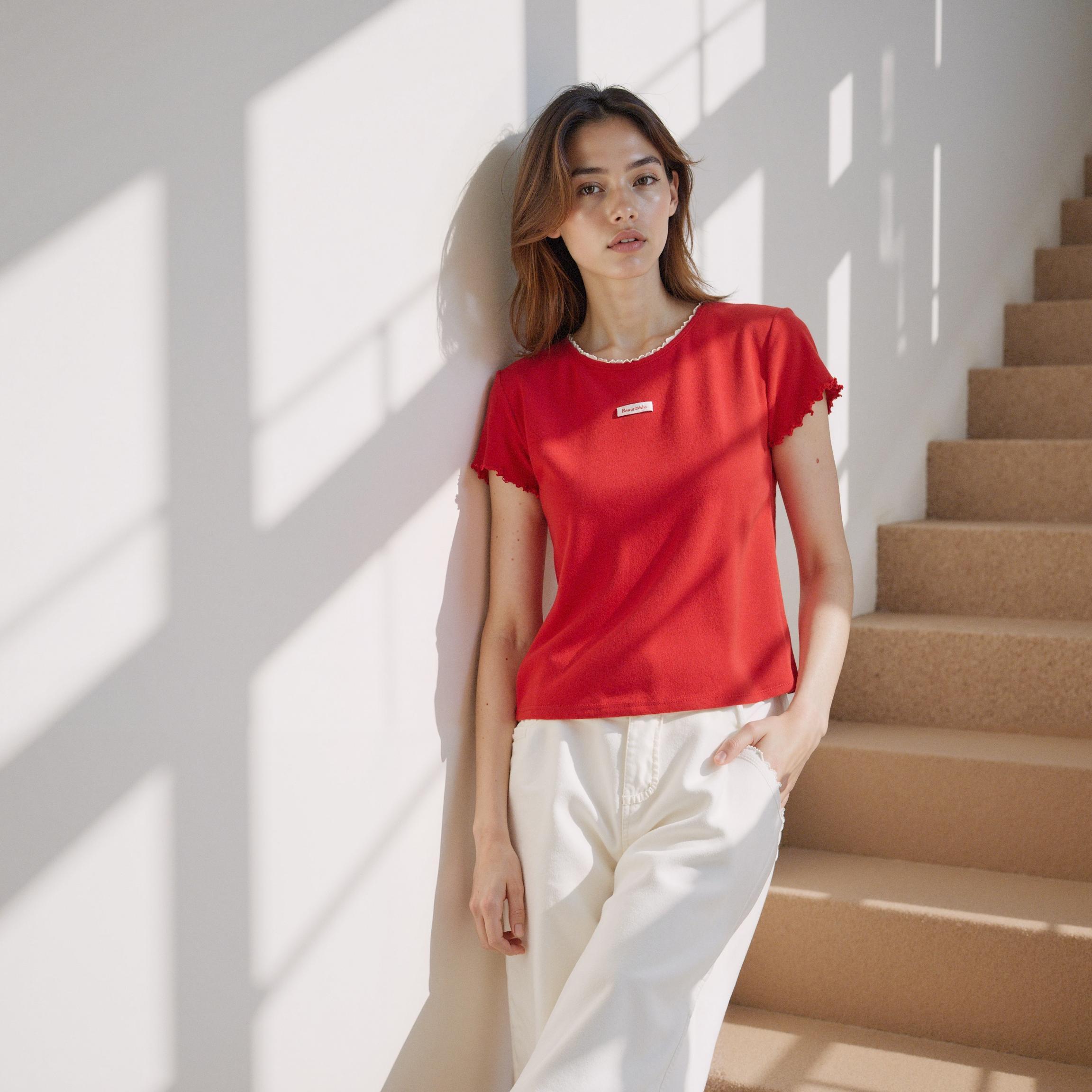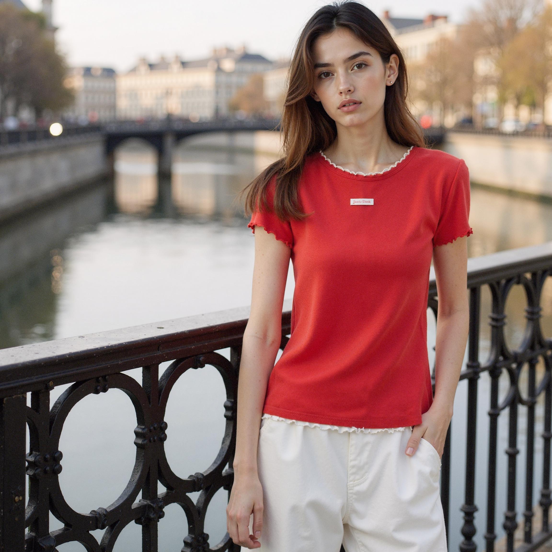 Through LaonGEN AI lookbook generation experiments, we discovered the extensive styling versatility of this seemingly simple t-shirt. The technology enabled visualization of diverse scenarios - from casual café settings to professional office environments and romantic date contexts - showcasing the product's adaptability across lifestyle situations.