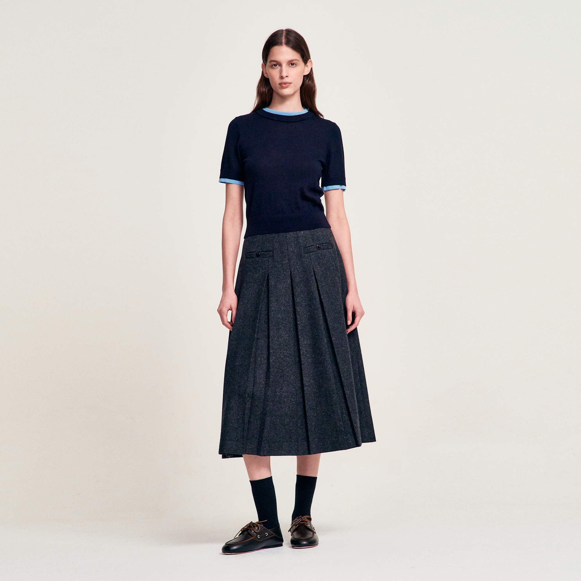 At the center of this lookbook lies the pairing of a navy knit top and a charcoal pleated skirt — a timeless combination that embodies SANDRO’s restrained romanticism.