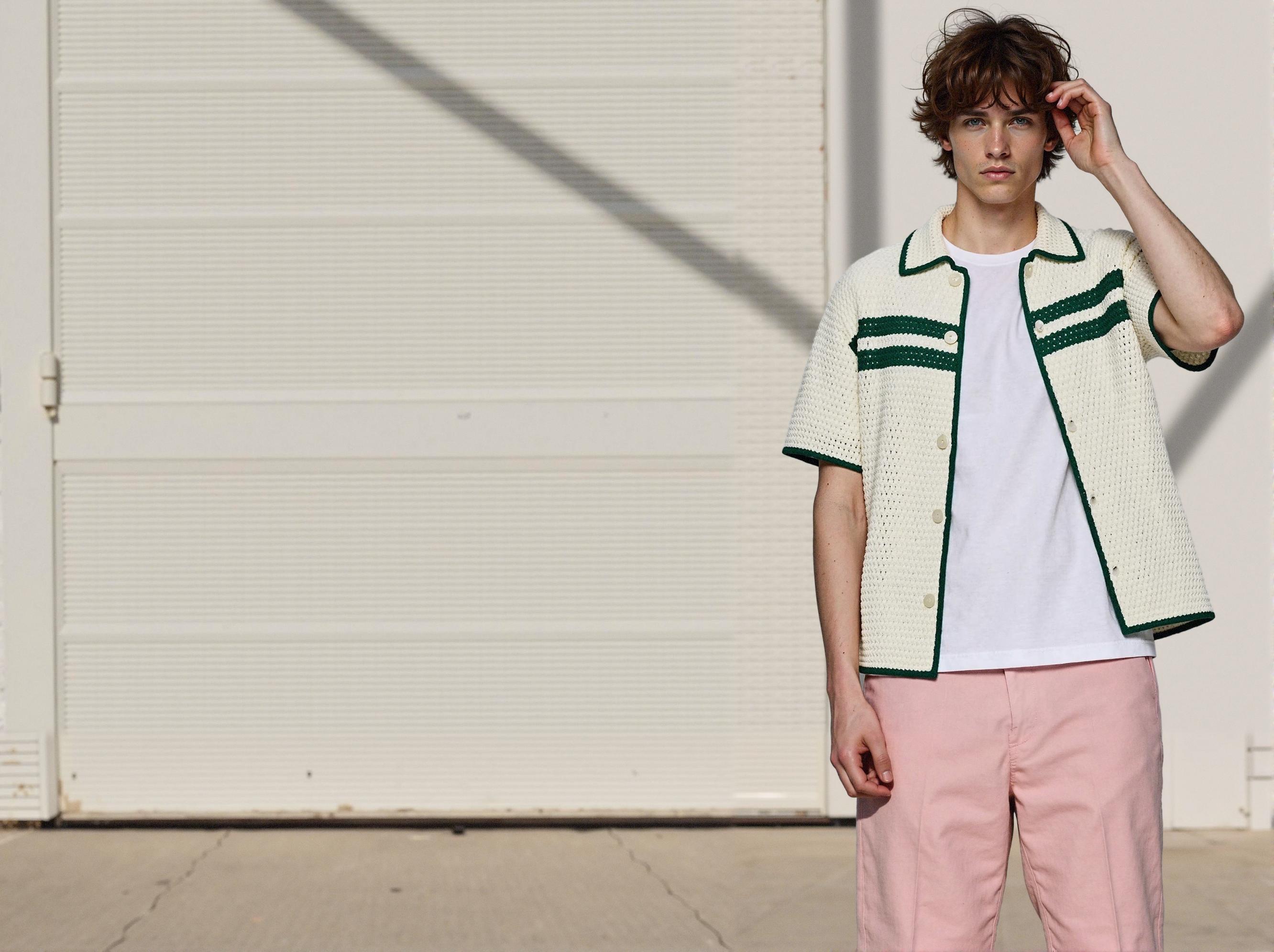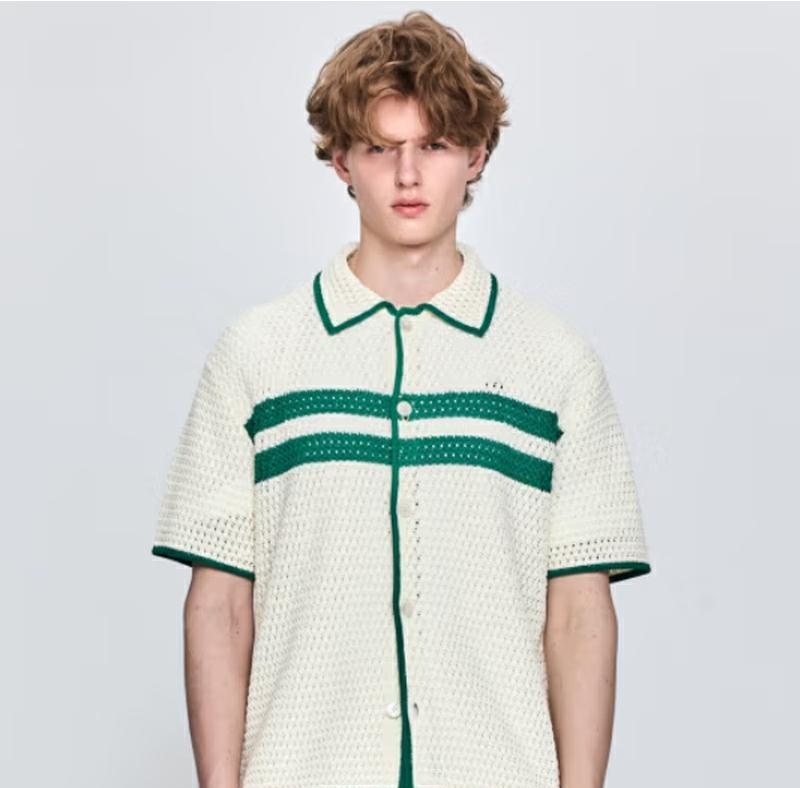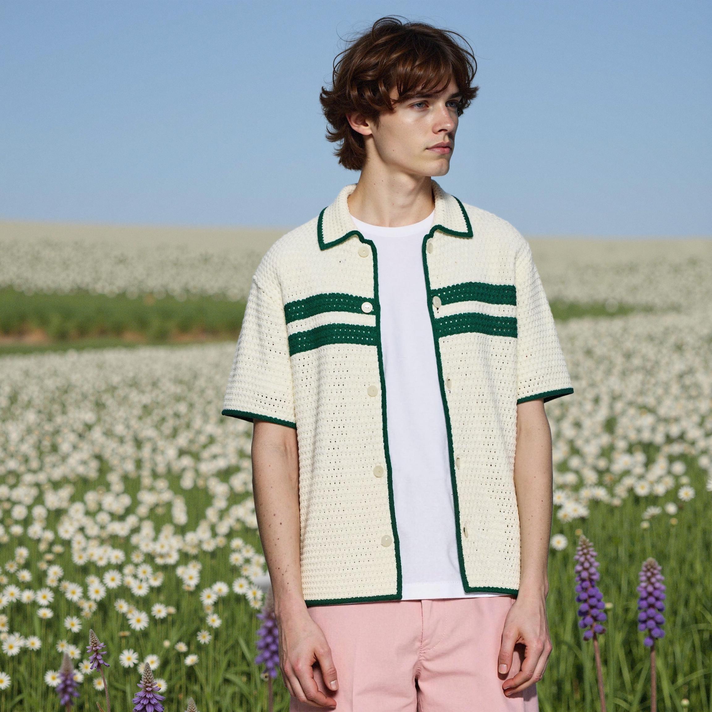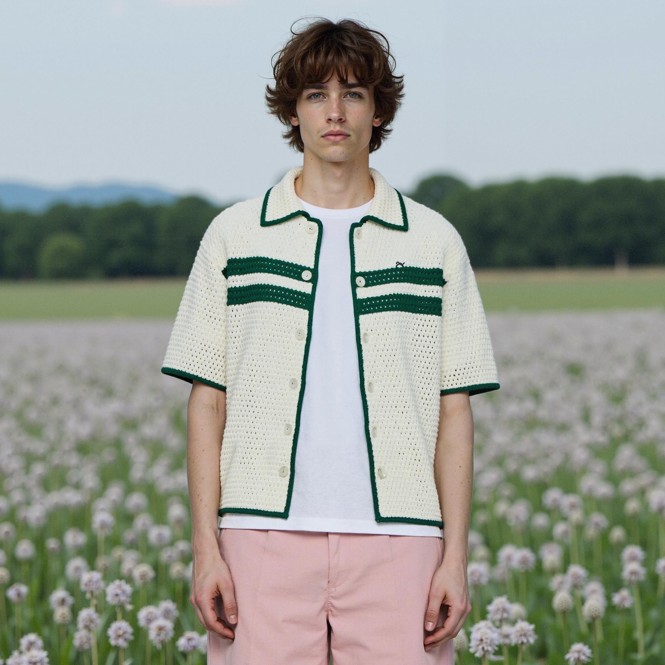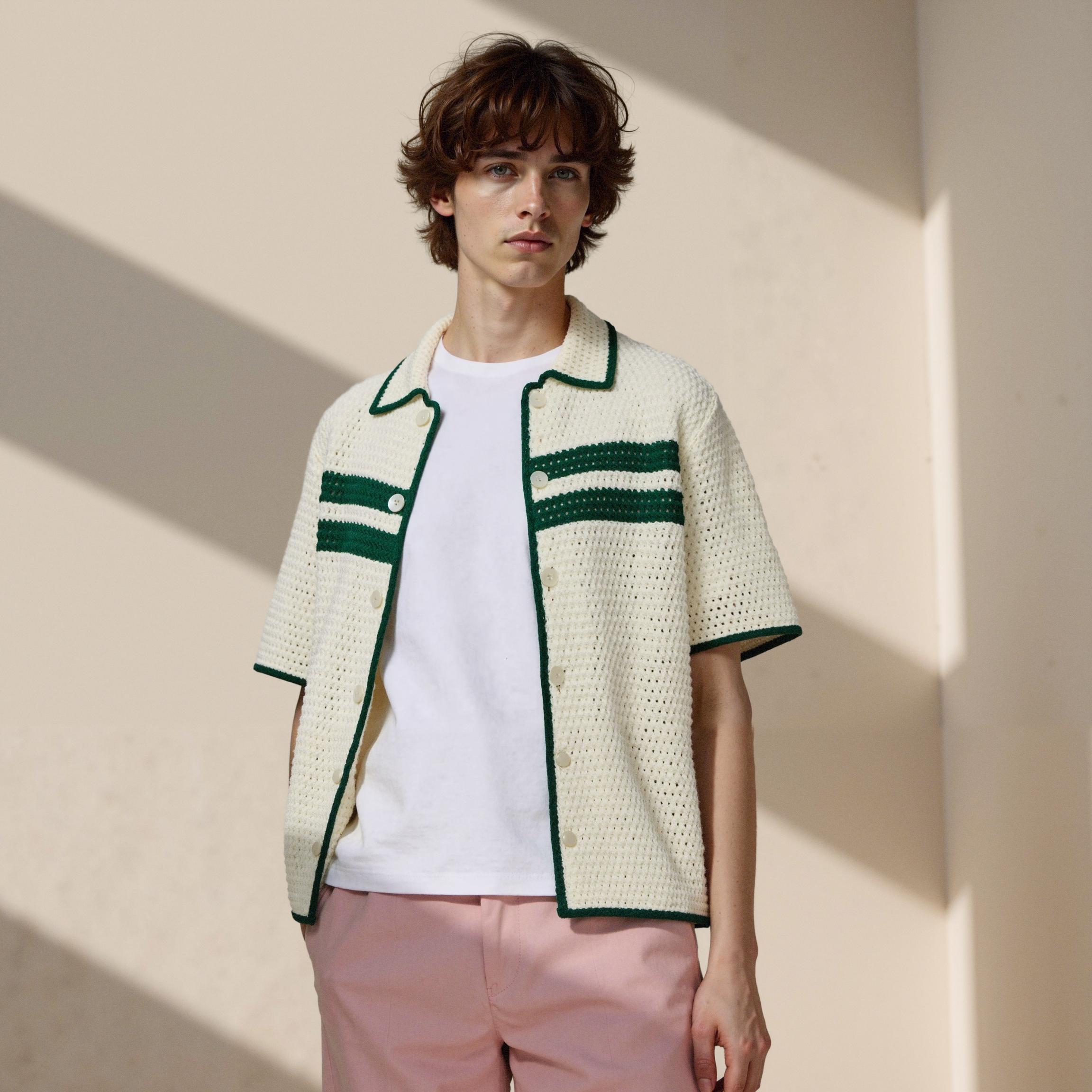 For this cardigan featuring cream base with green accent details, AI technology enables versatile styling from casual daily wear to semi-formal office attire. Despite being the same garment, completely different brand moods can be expressed through varying backgrounds, model poses, and lighting configurations.