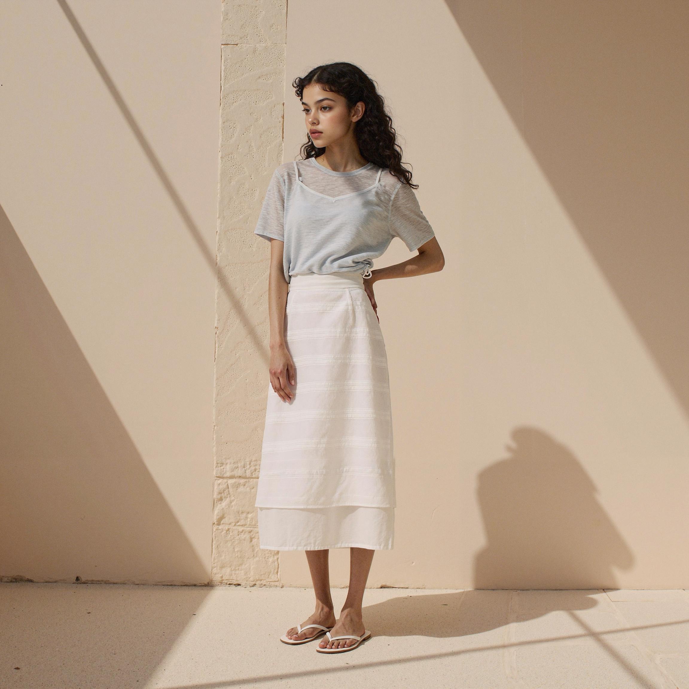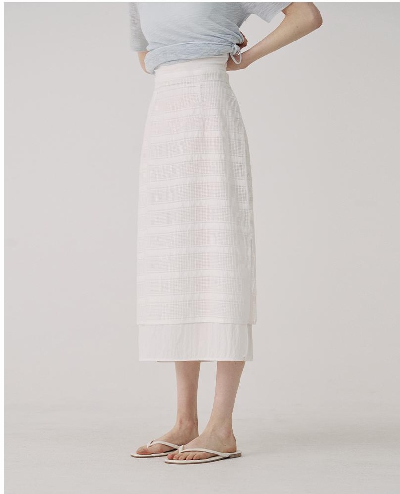 The featured item, the Layered Slit Skirt, combines clean lines with subtle layered details, creating a versatile piece for daily styling while maintaining a refined mood.