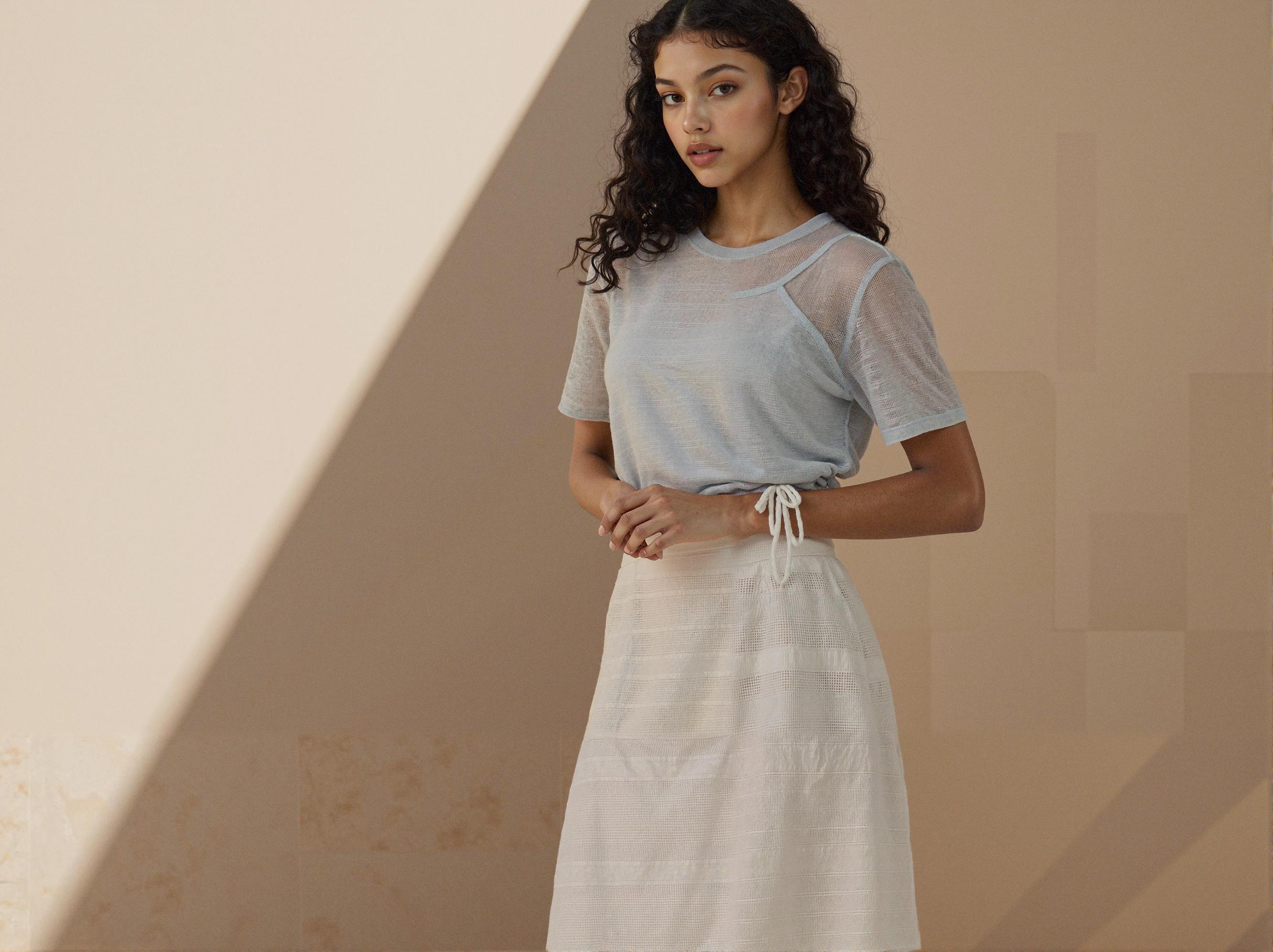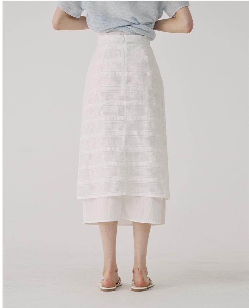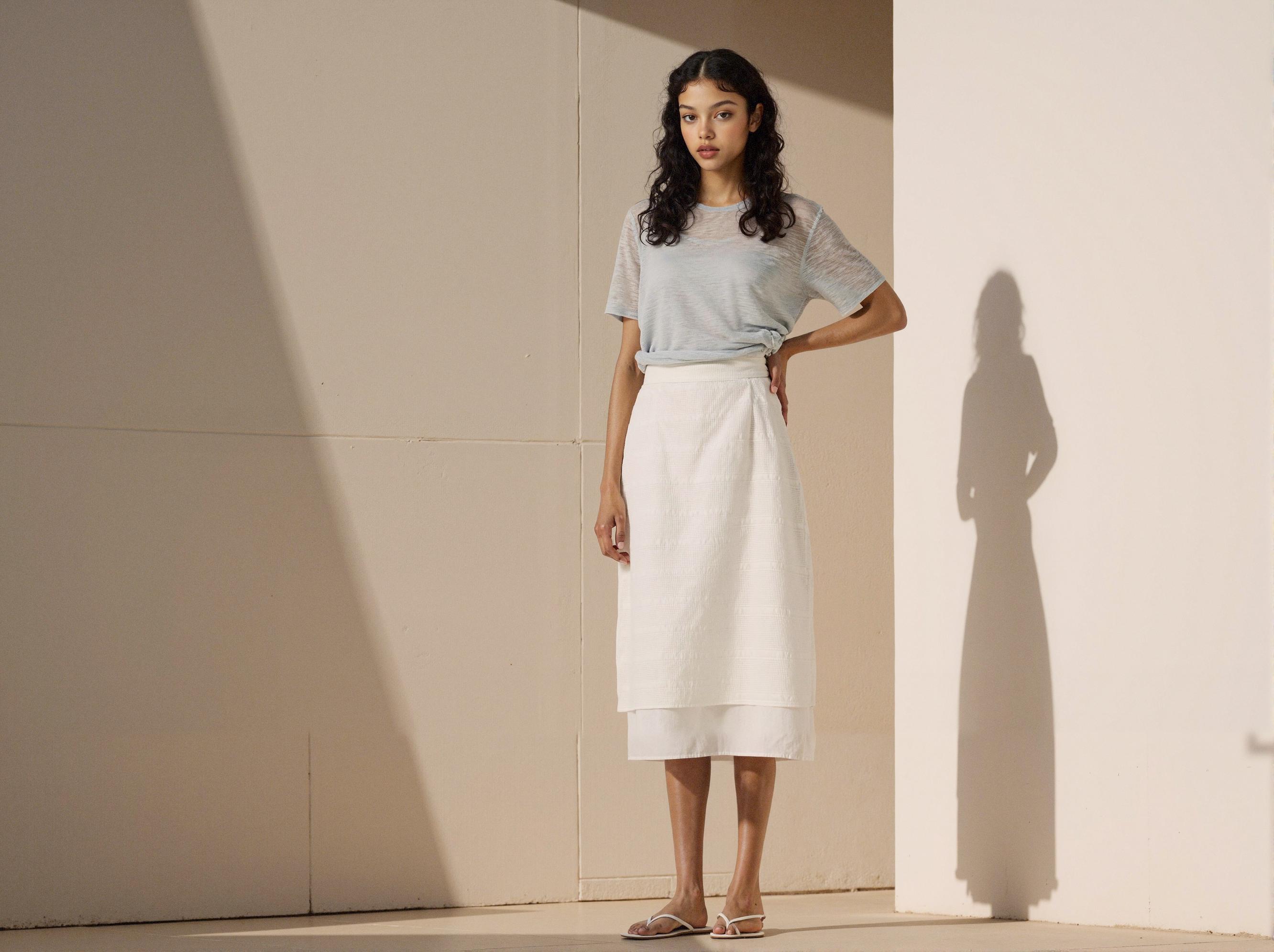 The featured item, the Layered Slit Skirt, combines clean lines with subtle layered details, creating a versatile piece for daily styling while maintaining a refined mood.
