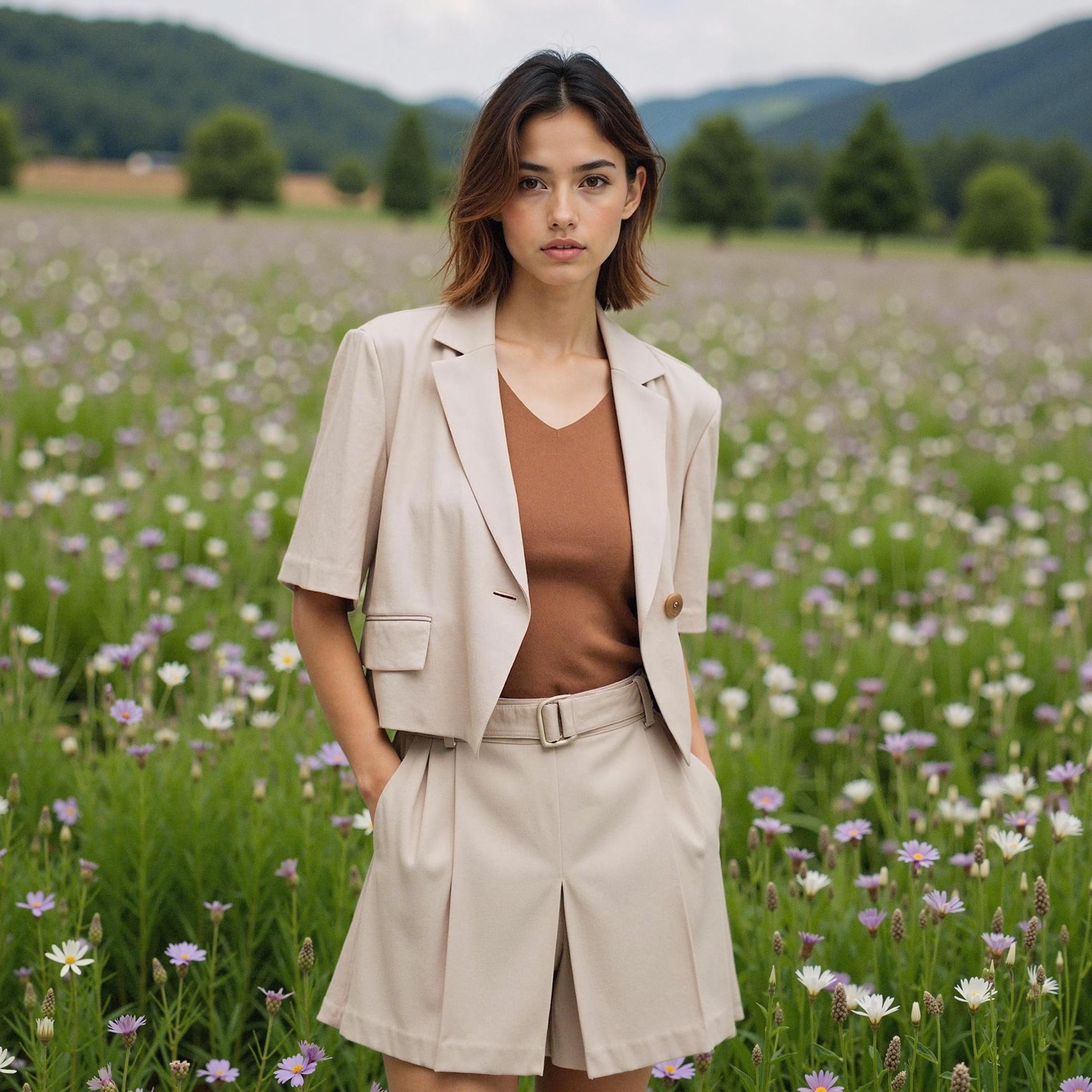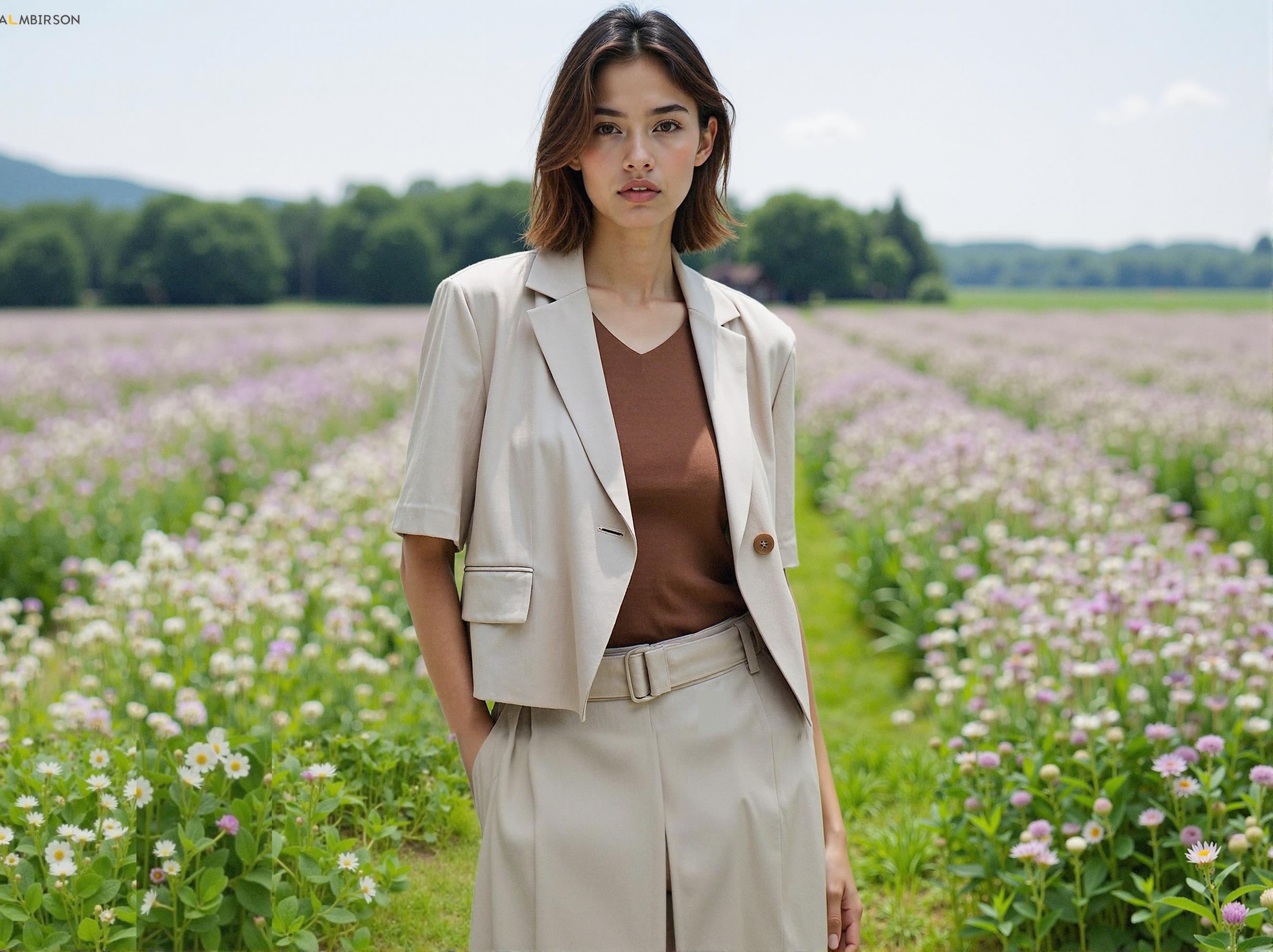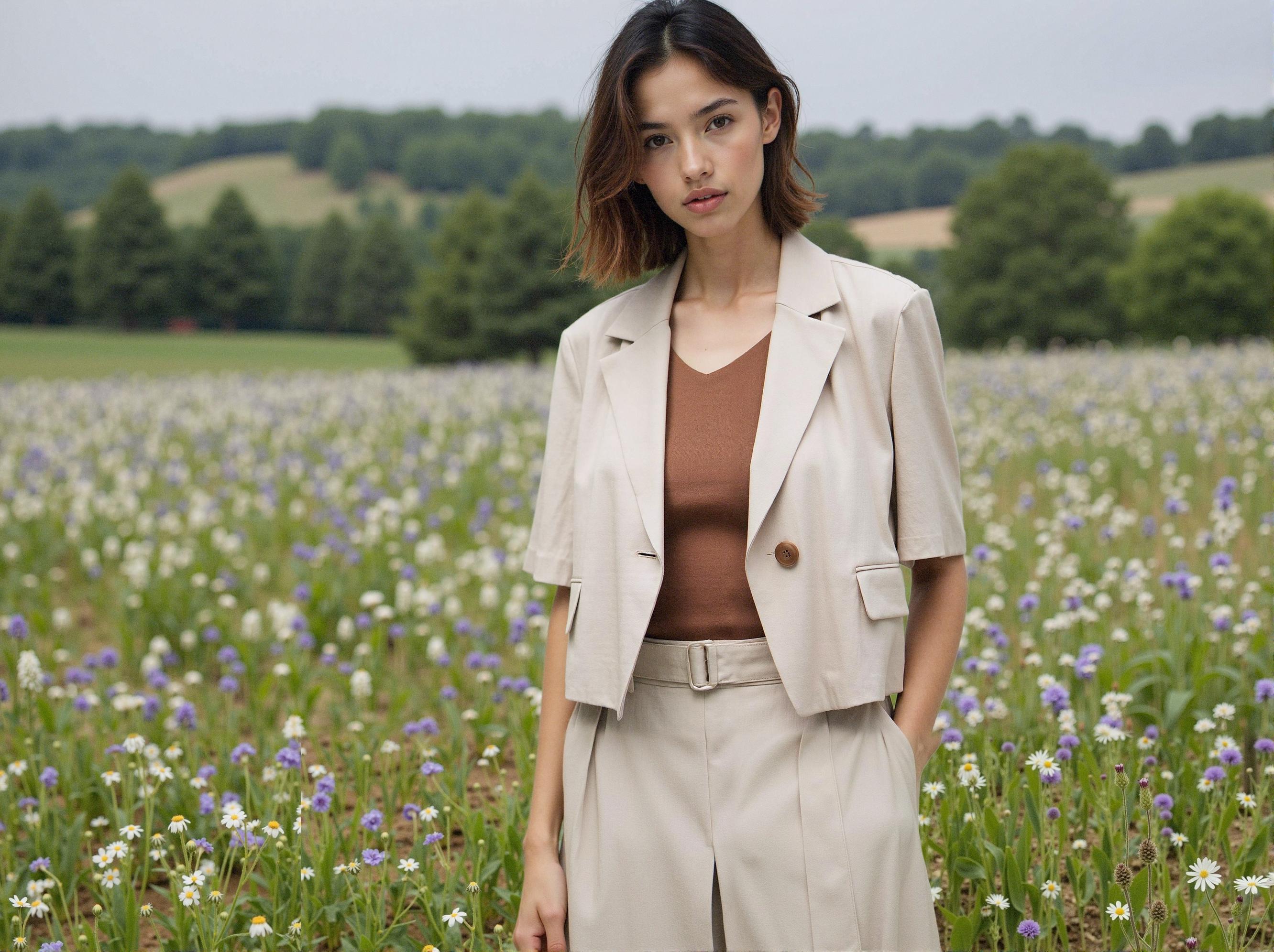 Natural settings such as flower fields or meadows provide the perfect backdrop for showcasing the jacket's soft, premium qualities. The beige tone harmonizes beautifully with natural lighting, creating an elevated, editorial-style aesthetic. Pairing with earth-toned innerwear creates a sophisticated tonal coordination.