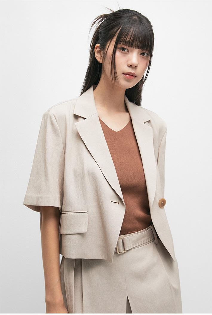 The sophisticated beige colorway offers remarkable versatility, seamlessly complementing various wardrobe pieces. The cropped length creates an optimal proportion that naturally enhances the wearer's silhouette, making it an ideal choice for both casual and elevated looks.