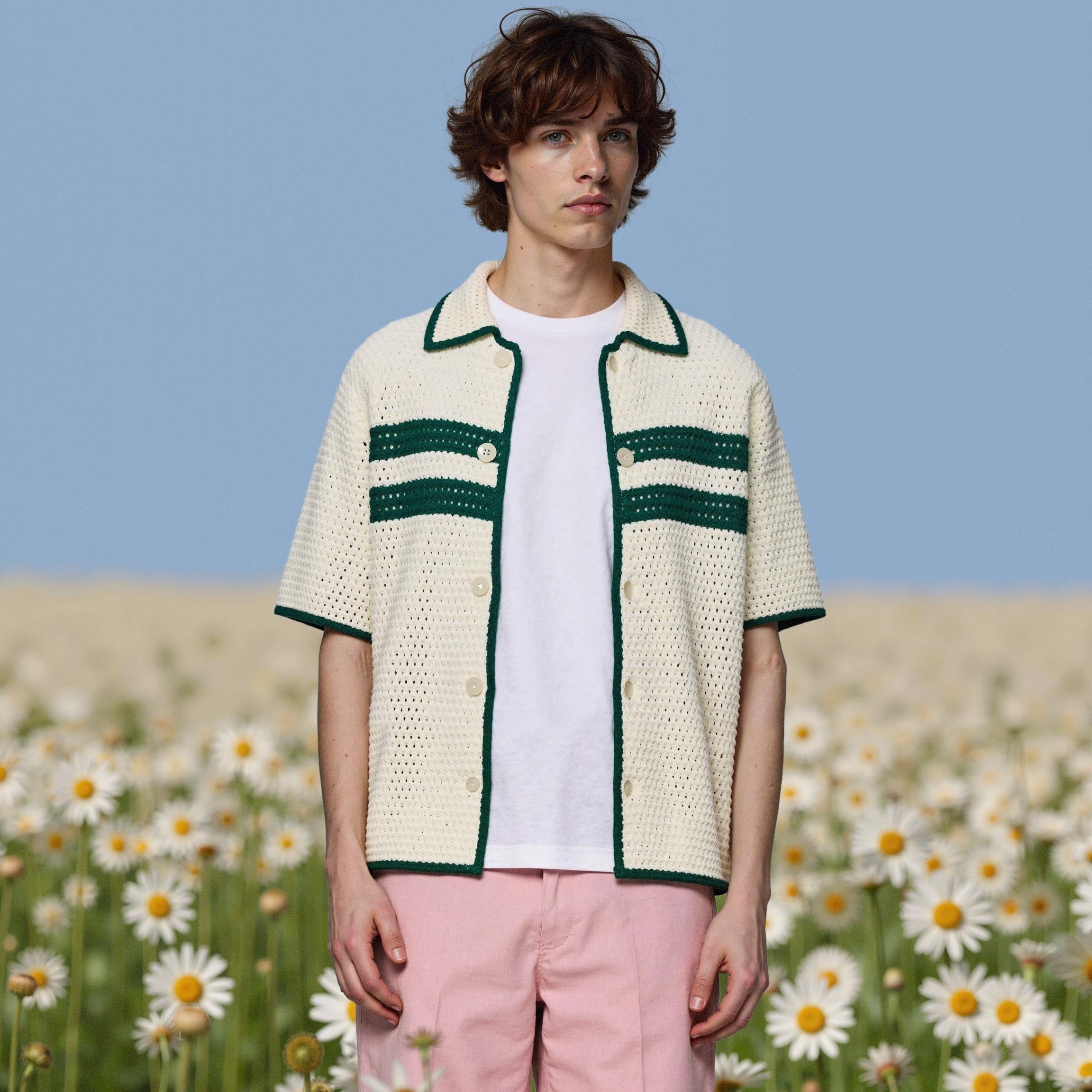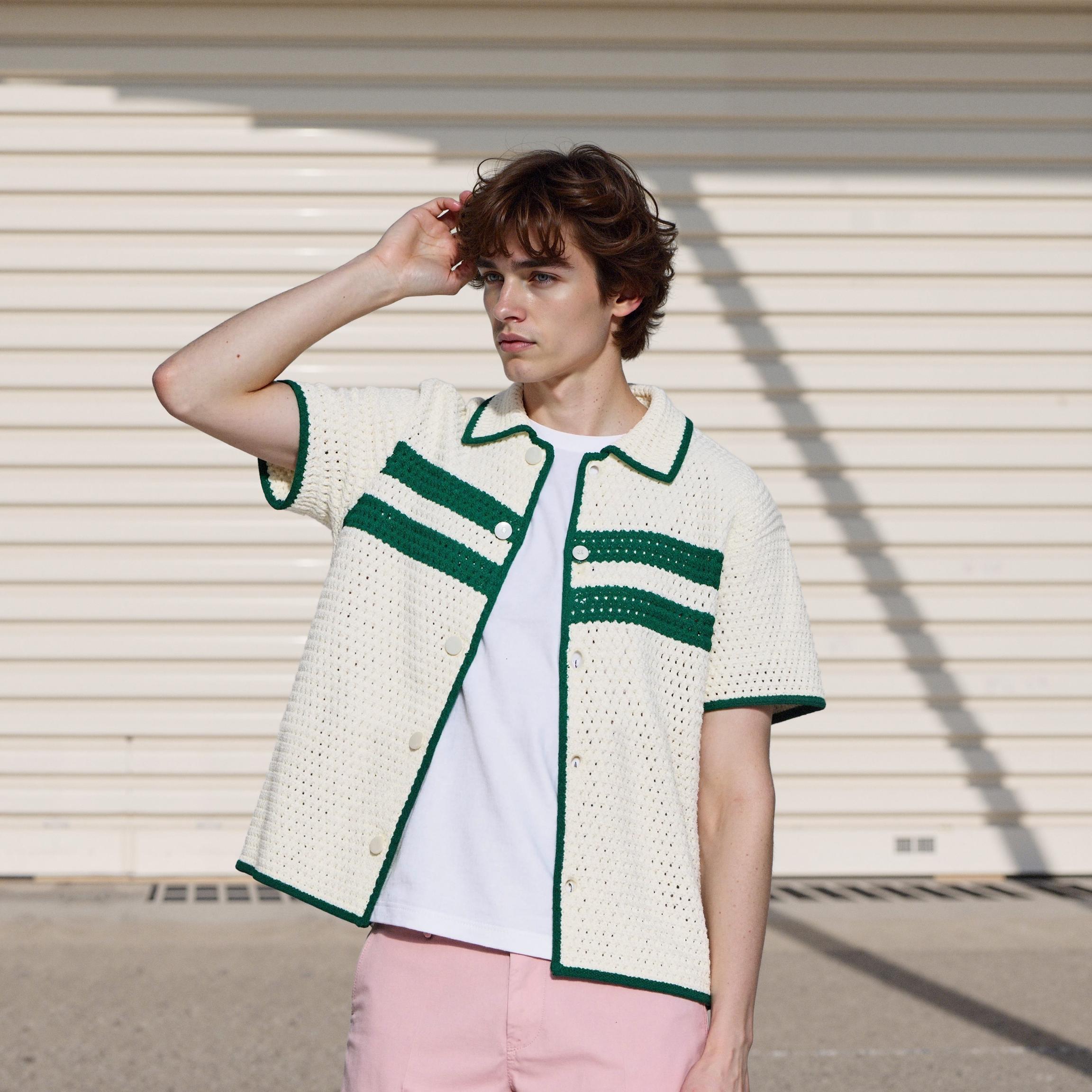 For this cardigan featuring cream base with green accent details, AI technology enables versatile styling from casual daily wear to semi-formal office attire. Despite being the same garment, completely different brand moods can be expressed through varying backgrounds, model poses, and lighting configurations.